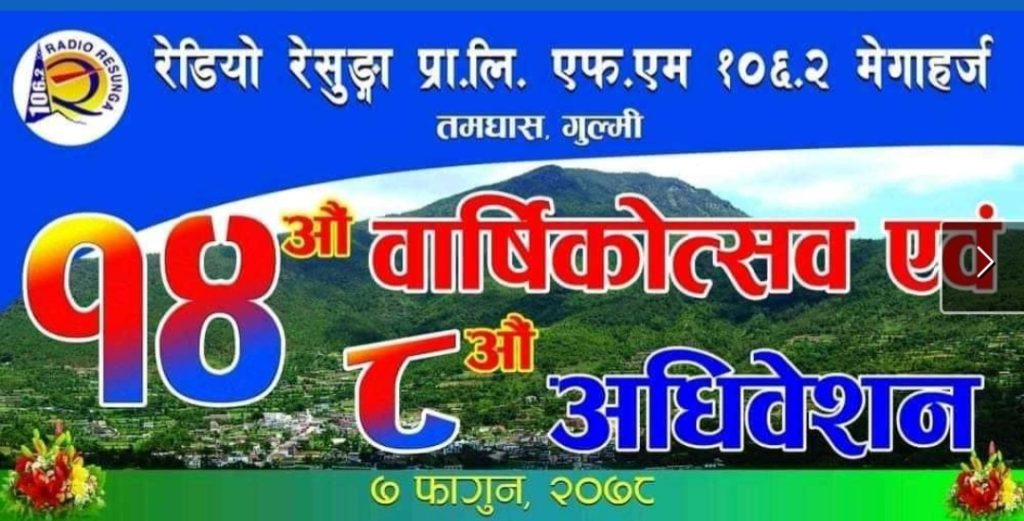 फागुन ०७,गुल्मी : जिल्लाको पहिलो रेडियो रेसुङ्गा एफ.एम.१०६.२ मेगाहर्जले आज देखि १५ औं वर्षमा प्रवेश गरेको छ । २०६४ साल फागुन ७ गते गुल्मी जिल्लामा पहिलो रेडियो स्टेशनको रुपमा स्थापना भएको रेडियोले आफ्नो सफलतम १४ औँ वसन्त पार गरि १५ औँ वसन्तमा प्रवेश गरेको हो । यस अवसरमा शुभकामना रेडियो सञ्चालक समितिका अध्यक्ष श्रीप्रसाद भलामीले रेडियो सञ्चालक समितिका सदस्यहरु, शेयरधनी, विज्ञापनदाता, रेडियोमा कार्यरत रेडियोकर्मी, संवाददाता, स्रोता, शुभचिन्तक सबैमा शुभकामना दिनुभएको छ ।