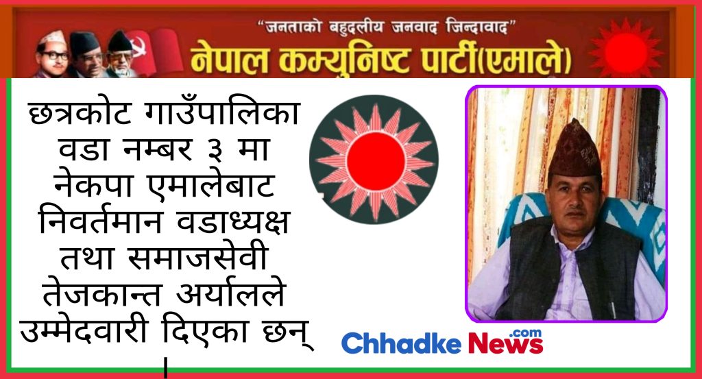बैशाख १३, गुल्मी – छत्रकोट गाउँपालिका वडा नम्बर ३ मा नेकपा एमालेबाट निवर्तमान वडाध्यक्ष तथा समाजसेवी तेजकान्त अर्यालले उम्मेदवारी दिएका छन् । अर्याल २०७४ को स्थानिय निर्वाचनमा पनि भारी मतका साथ वडाध्यक्षमा निर्वाचित भएका थिए ।