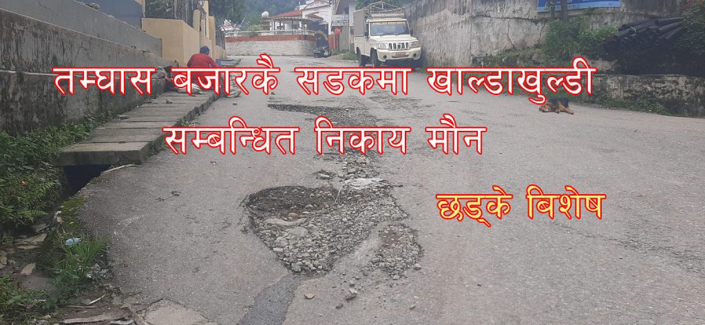 तिलाचन पाण्डे,छड्के न्युज\ गुल्मी -गुल्मी सदरमुकाम तम्घासको मुख्य सडकमै ज्यानमारा खाल्डाहरु हुँदा सम्म मर्मतमा सरोकारवाला कसैको ध्यान जान सकेको छैन् ।जिल्ला प्रशासन कार्यालय अगाडी पछाडी र प्रहरी कार्यालयमा जाने मुख्य सडकमै ठुला ठुला खाडल रहेका छन् । सोही बाटो भएर दिनमा सयौ पटक ओहोर दोहोर गर्ने प्रहरी प्रशासन र नगरपालिका प्रमुखहरु देखेको नदेख्यै गरी आँखा चिम्लेर हिड्ने गरेको पाइएको छ ।