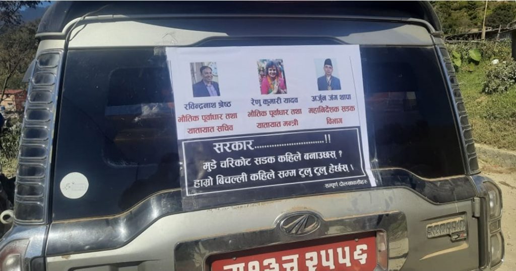 दोलखा -लामोसाँघु–जिरी सडकखण्डअन्तर्गत दोलखा प्रवेश गर्ने मुख्य मार्ग मुडे–चरिकोट खण्ड ठेक्का लगाएर वर्षौँदेखि अलपत्र पारेको भन्दै जिल्लावासीले विरोध गरेका छन् । भौतिक पूर्वाधार तथा यातायातमन्त्री, सचिव र सडक विभागका महानिर्देशकको तस्बिर सार्वजनिक सवारीमा टाँसेर जिल्लावासीले विरोध जनाएका हुन् ।मन्त्री रेणुकुमारी यादव, मन्त्रालयका सचिव रवीन्द्रनाथ श्रेष्ठ र सडक विभागका महानिर्देशक अर्जुनजंग थापाको फोटो सार्वजनिक सवारीसाधनमा टाँसेर विरोध प्रदर्शन गरेका छन् ।