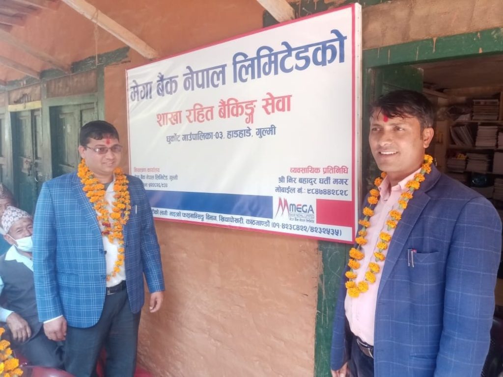 चैत २३ , गुल्मी : मेगा बैंक नेपाल लिमिटेडले गुल्मी जिल्लाको धुर्कोट गाउँपालिकामा शाखा रहित बैंकिङ्ग सेवाको शुरुवात गरेको छ । ग्रामीण क्षेत्रका वासिन्दाहरुलाई बैकिङ्ग पहुँच विस्तार गर्ने उद्धेश्यले धुर्कोट गाउँपालिकाको वडानम्बर–३ हाडहाडेमा शाखा रहित सेवाको विस्तार गरिएको मेगा बैंक तम्घास शाखा प्रमुख कालिदास पाण्डेले बताए ।