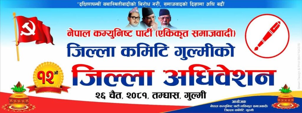 गुल्मी: नेपाल कम्युनिस्ट पार्टी एकीकृत समाजवादी गुल्मीको बाह्रौं अधिवेशन यहि चैत्र २६ गते तम्घासमा हुने भएको छ ।