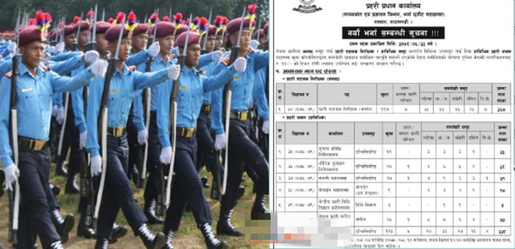 इच्छुकहरूलाई आवेदन दिन प्रहरी प्रधान कार्यालयले आग्रह गरेको छ। कात्तिक ३ गतेदेखि मंसिर १२ गतेभित्र आवदेन दिइसक्नुपर्नेछ। प्रहरी सहायक निरीक्षकका लागि तीन सय र प्रहरी जवानलाई एक सय ५० दस्तुर लाग्नेछ।प्रहरी सहायक निरीक्षकका लागि प्लस टु गरेको र १८ वर्ष पूरा भएर २४ वर्ष ननाघेको हुनुपर्नेछ भने प्रहरी जवानलाई एसएलसी गरेको र १८ वर्ष पूरा भई २३ वर्ष ननाघेको हुनुपर्नेछ। नेपाल प्रहरी नेपालको गैर–सैनिक प्रहरी सेवा हो ।