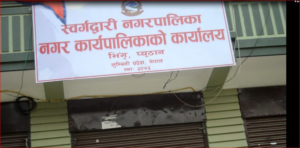 प्यूठानको स्वर्गद्वारी नगरपालिकाका कर्मचारीले तलब पाएका छैनन् । साउन महिनादेखि अहिलेसम्म तलब नपाएको कर्मचारीले बताएका छन् ।साउनदेखि रोकिएको तलब दशैसम्म पाउने आशमा बसेका कर्मचारी दशैको मुखमा रित्तो हात घर जानु परेको गुनासो गरे । जिल्लाका अन्य कार्यालय तथा स्थानीय तहका कर्मचारीले दशै भत्तासहितको तलब पाए पनि नगरपालिकाका कर्मचारी दशैको मुखैमा तलब बिहिन भएका छन् । दशैमा तलब बुझेर परिवारलाई खुसी दिने सपना बोकेका कर्मचारी निराश हुदै घर फर्किन बाध्य भएका हुन् ।नगरपालिकाले आर्थिक बिबरण टुङ्याउन नसकेका र अहिलेसम्म अख्तिीयार नआएका कारण कर्मचारी तलब दिन नसकेको स्वर्गद्वारी नगरपालिकाका प्रमुख प्रशासकीय अधिकृत बम बहादुर केसीले बताए । नगरपालिकाका केहि योजनाको ब्रेक डाउन गर्न बाकी रहेको र २ बर्षको अडिट बाकी रहेका कारण यो समस्या आएको उनको भनाइ छ । नगरपालिकाले समयमै आर्थिक बिवरण टुङ्याउन नसक्दा नगरका कर्मचारी, शिक्षक,जेष्ठनागरिक, स्वास्थयकर्मी लगायतका कर्मचारी तलब तथा बृद्धा भत्ता बिहिन भएका हुन् ।