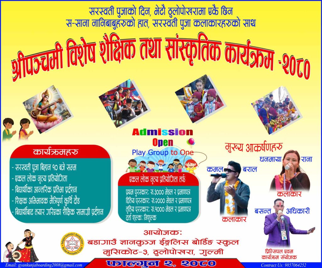श्रीपन्चमीको अवसरमा सरस्वती पूजाको साथै कक्षा नर्सरी देखि एक सम्मको वार्षिक परिक्षाको परिक्षाफल प्रकाशन, एकल रेकर्ड डान्स प्रतियोगिता, विद्यार्थीले बनाएका शैक्षिक सामाग्री प्रर्दशन, शिक्षक अभिभावक मैत्रीपुर्ण कुर्चिदौड बच्चाले आफुले जानेका अन्तरनिहित प्रतिभा प्रर्दशन र कलाकारहरुको प्रस्तुति समेत राखिएको छ, कलाकाहरु लोक गायक कमल बराल लोक गायिका धनमाया राना लगाएत स्थानिय कलाकारहरुको प्रस्तुती रहने अतिरिक्त क्रियाकलाप संयोजक शिक्षक भिम कार्कीले बताउनु भयो ।