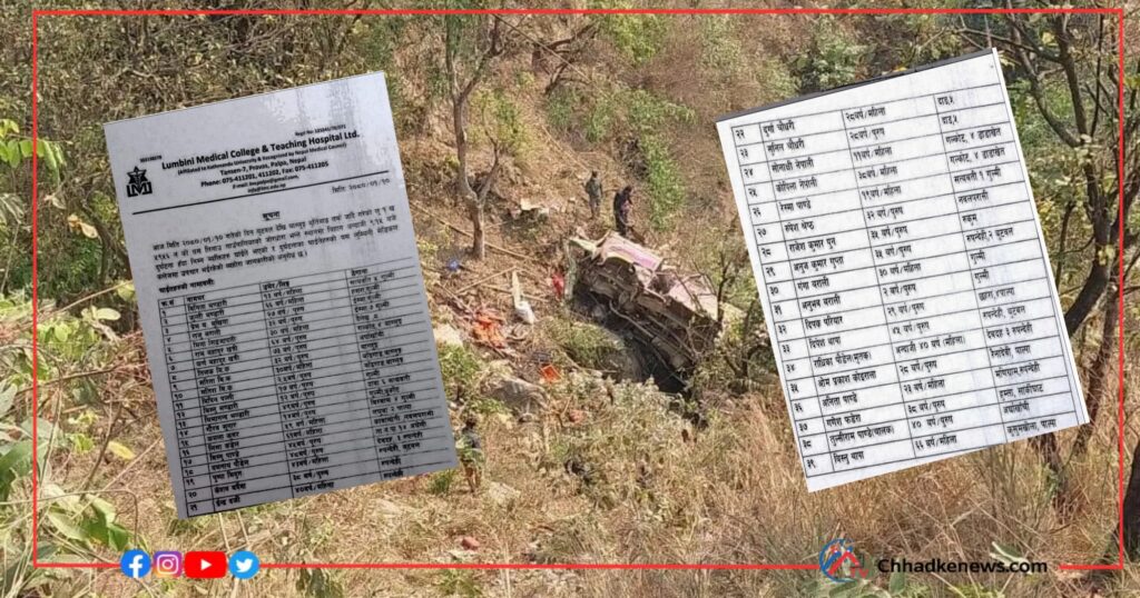 दुर्घटनामा परि मृत्यु हुनेमा रुपन्देही देबदह नगरपालिका ३ की ४० बर्षीया राधिका पौडेल रहेको लुम्बिनी मेडिकल कलेजले जनाएको छ ।