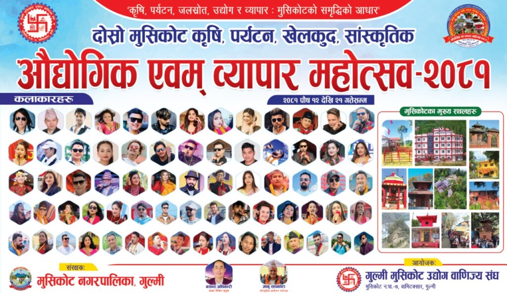 गुल्मी मुसिकोट उद्योग वाणिज्य संघ मुसिकोटको आयोजनामा पौष १२ देखि २१ गतेसम्म हुने दोस्रो मुसिकोट कृषि, पर्यटन, खेलकुद, साँस्कृतिक एवं व्यापार मेला २०८१ मा अत्याधिक राशिको खुल्ला पुरुष भलिबल प्रतियोगिता हुने भएको छ ।