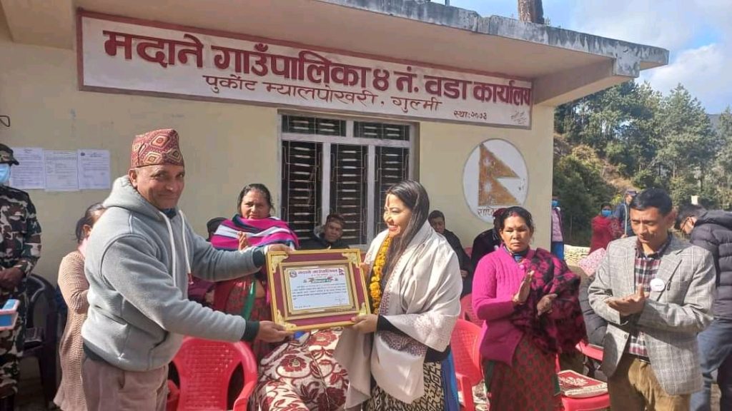 आईतवार उनको स्वागतमा मदाने गाउँपालिका ४ वडा कार्यालय लगायत यहाँ रहेका विभिन्न राजनीति दलका नेता,कार्यकर्ता,सामाजिक व्यक्ति,आमा समूह, क्लब, विभिन्न संघसंस्थाका प्रतिनिधि, र स्थानीयवासी लामवद्घ भई फूलमाला र खादा लगाई सम्मानपत्रले समेत सम्मान गरेका थिए ।