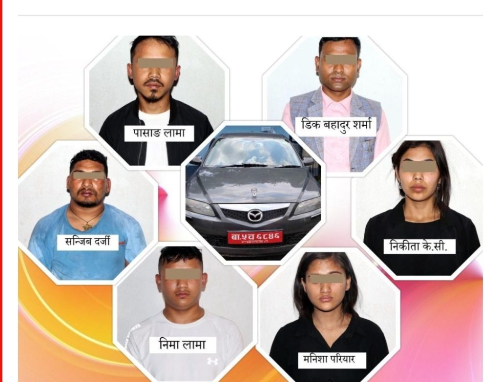 प्रहरीले सूर्यविनायक–९ भक्तपुरकी १९ वर्षीया निकिता केसी काभ्रेपलान्चोक घर भइ हाल पेप्सिकोला बस्ने १८ वर्षीया मनिषा परियार, हलेसी–७, खोटाङका ३२ वर्षीय डिक बहादुर शर्मा, इटहरी–७ सुनसरी घर भइ काठमाडौंको तारकेश्व बस्ने वर्ष ३० को सन्जिब दर्जी र मेलुङ–५, दोलखा घर भइ हाल नख्खिपोट बस्ने २५ वर्षको निमा लामा तथा सोही स्थानको वर्ष ३० को पासाङ लामालाई पक्राउ गरेको हो ।