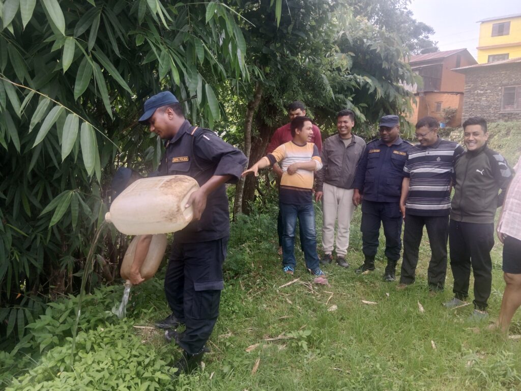 गस्तिका क्रममा बेवारिसे रुपमा मदिरा भेटिएकोले उक्त मदिरा नियन्त्रणमा लिई जनप्रतिनिधि, संघ सस्था प्रमुख, स्थानिय समाजसेवी, पत्रकारहरुको रोहवरमा नष्ट गरिएको अस्थायी प्रहरी चौकीका ईन्चार्ज वरिष्ठ ह. असोक कुमार धमालले जानकारी दिए ।